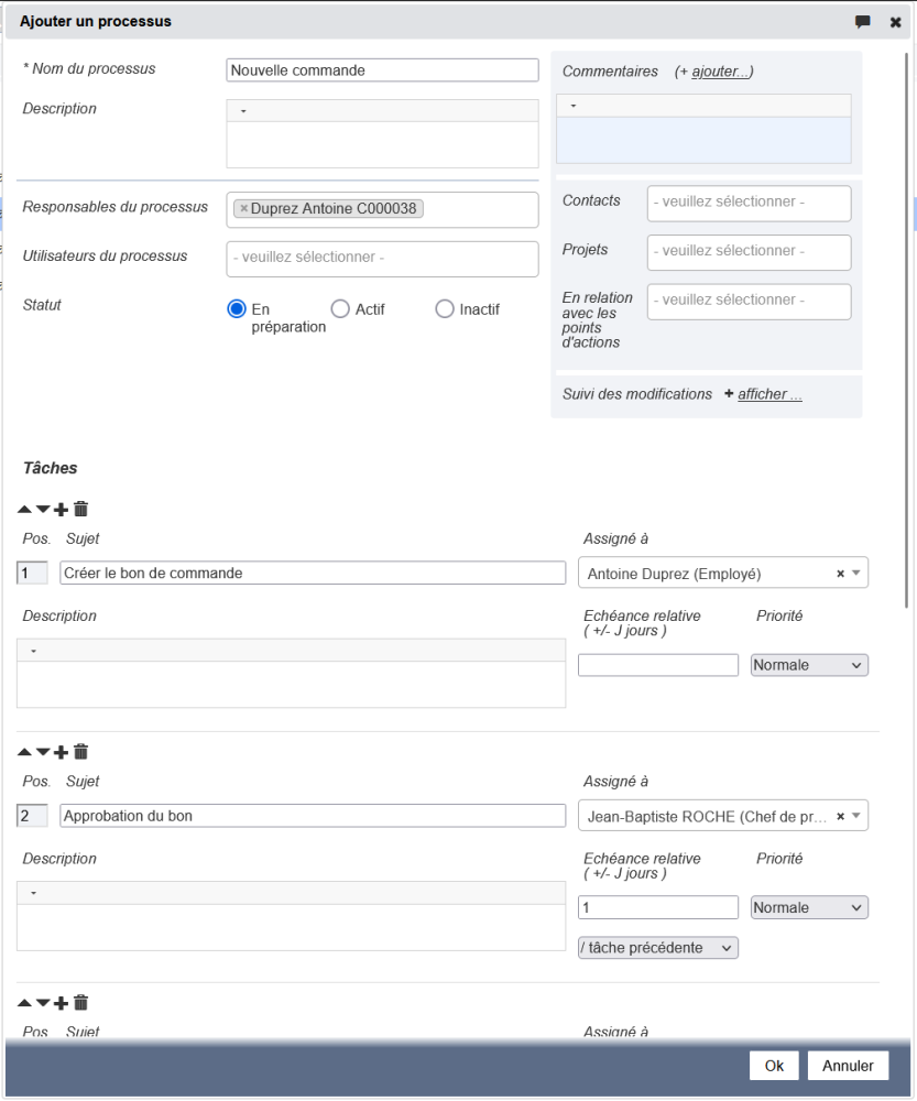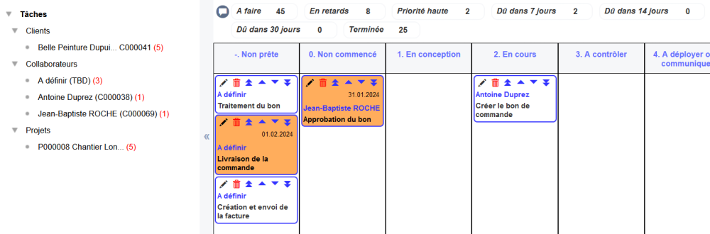 Les tâches sont créées selon le processus, directement assignées aux personnes définies, au client et au projet.