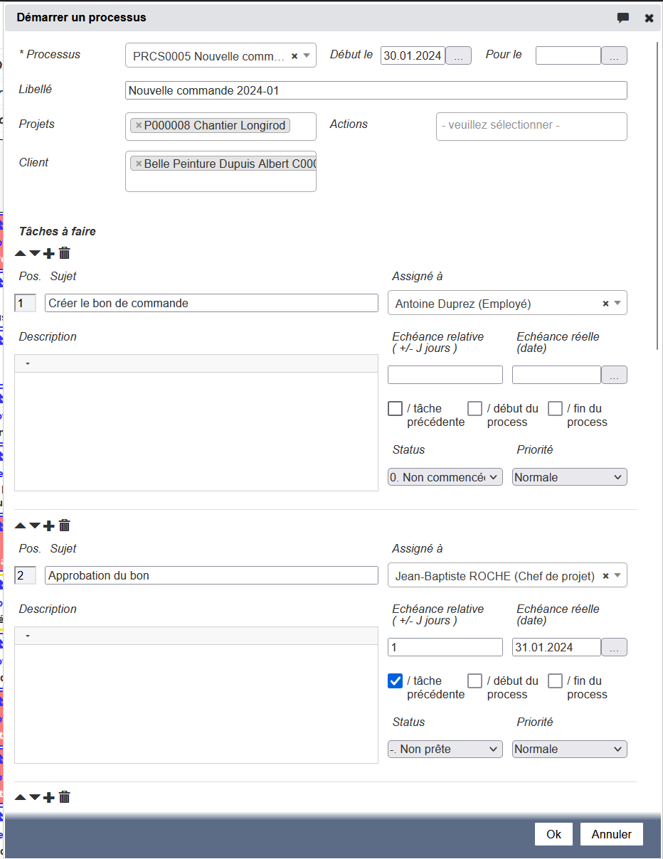 La fenêtre permet la sélection du processus souhaité, par exemple "Nouvelle commande". Il est possible ici de spécifier le client, le projet associé, ainsi que d'autres détails plus précis. Il est aussi possible à ce stade de supprimer ou ajouter certaines étapes.