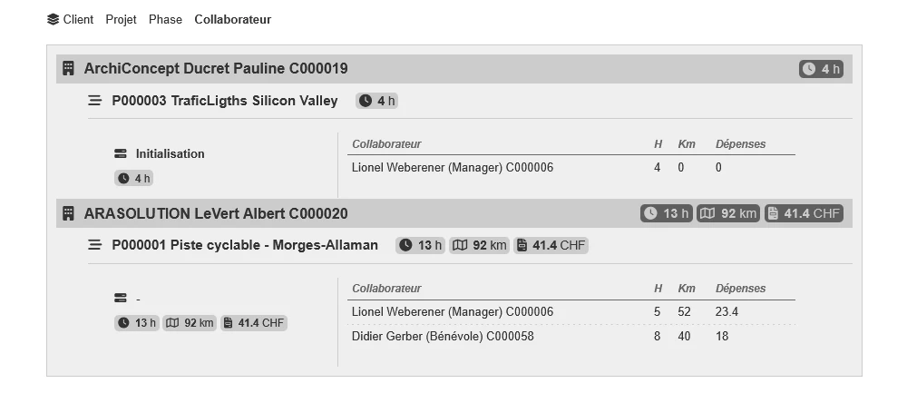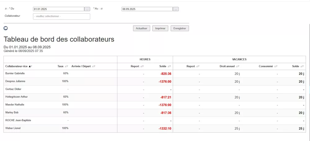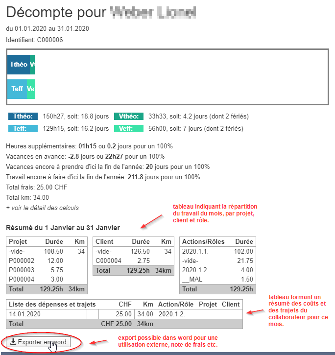 Tableaux de bord récapitulatif automatique pour le collaborateur indiquant ses heures supplémentaires, ses vacances disponibles et un résumé des projets/clients/actions sur lesquels il a travaillé :