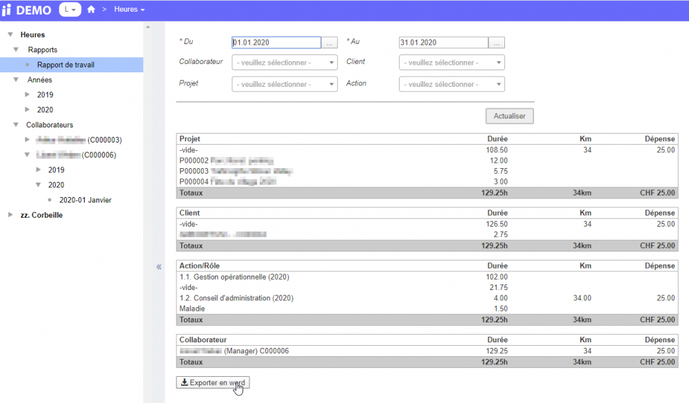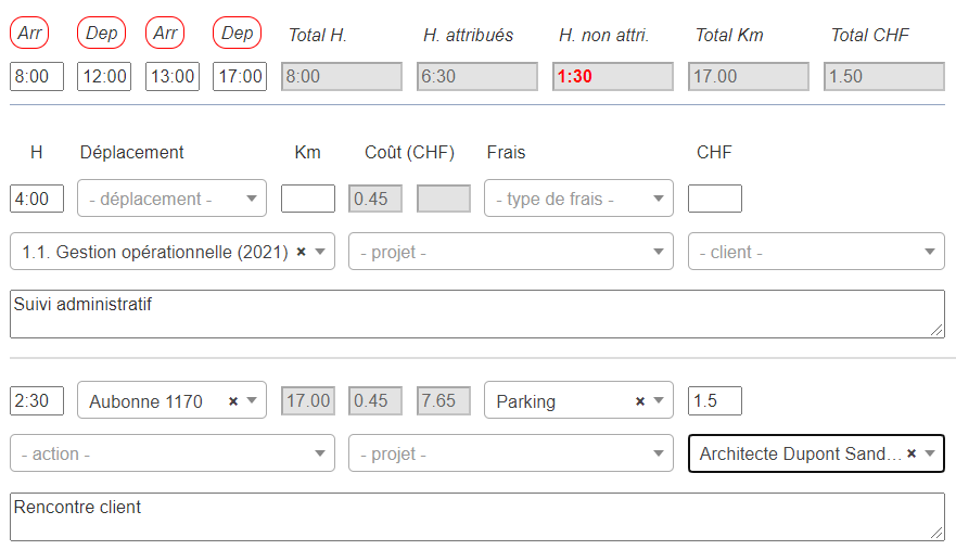 Introduction du travail journalier avec allocation des heures, km et dépense par actions, projet et client: