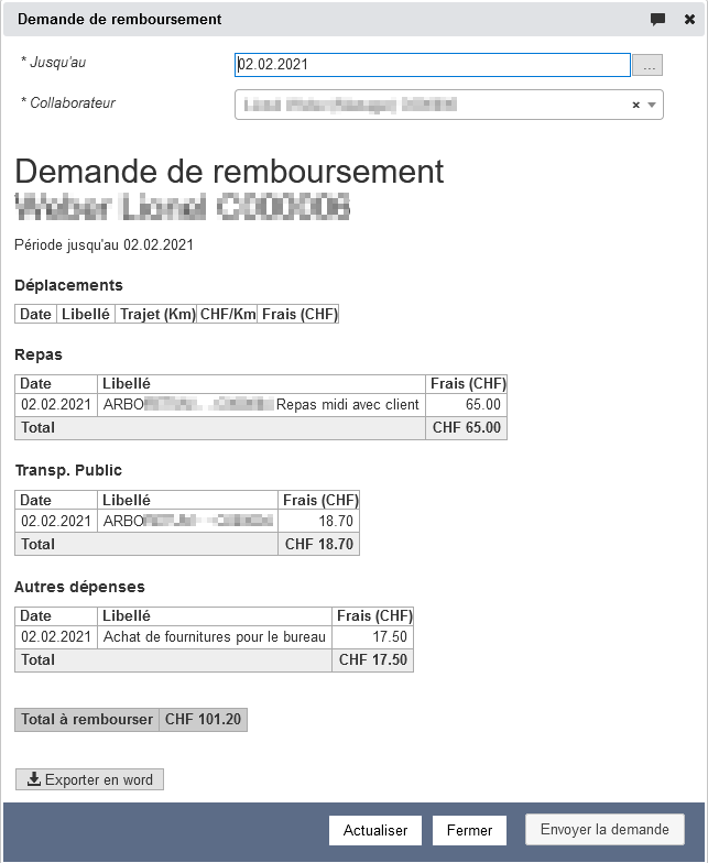 Bouton "Demande de remboursement" qui prépare automatiquement le contenu, et l'envoie dans le processus d'approbation du module Fichiers. Ce processus intégré filtre automatiquement les frais déjà insérés dans une demande de remboursement passée.